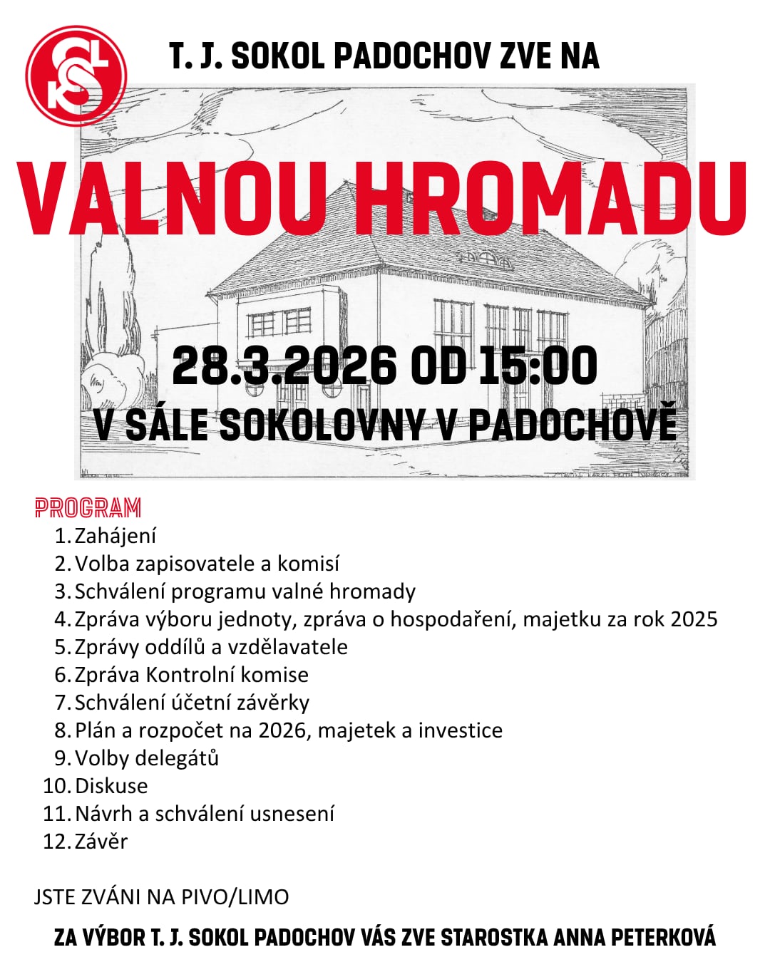 T. J. Sokol Padochov srdečně zve na sokolský ples, který se bude konat v sále sokolovny v Padochově