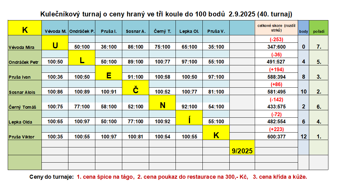 Gratulujeme vítězům a děkujeme všem za účast. Kulečníkovému oddílu děkujeme za uspořádání turnaje.