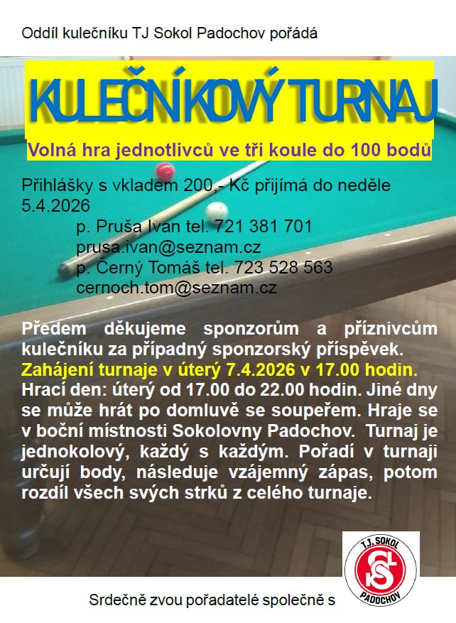 Gratulujeme vítězům a děkujeme všem za účast. Kulečníkovému oddílu děkujeme za uspořádání turnaje.