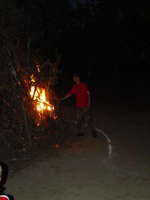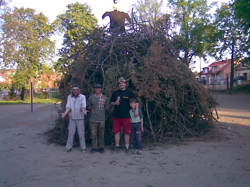 Hraničku na čarodějnický oheň vždycky skládala omladina, ale časy se mění, a tak jak to bývá zvykem, mládí sedí doma u počítačů a "staří blbci" staví v pěti lidech hranici. To, že to byla pořádná hromada vidíte na snímcích. Navenek neuspořádaná ale měla zdravé jádro z loňské májky takže jsme čekali, že "zčudne" přímo bleskově. Nahoru jako vždy přišla replika vylosované místní krasavice a mohlo se začít.