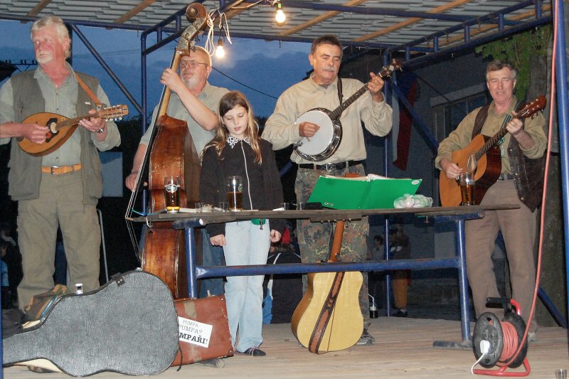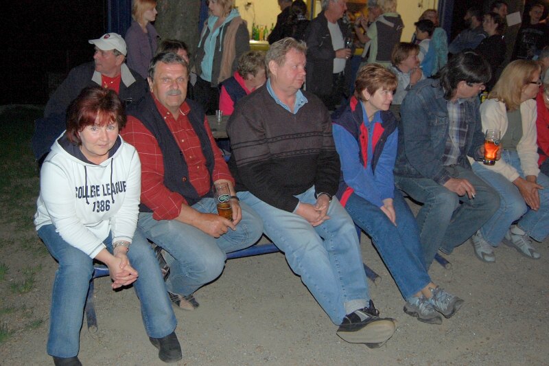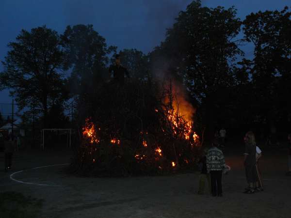 Večer pak od 19 hod. zahrála a zazpívala skupina Pumpaři a "čarodějnice" se začaly scházet. Za zvuku tradiční trampské písně "Táboráku plápolej, táboráku jásej" proběhlo několik pokusů o jednoduché zapálení ohně. Bohužel syrové větve, které obklopovaly suché jádro nám situaci hodně zkomplikovaly. Jen díky vytrvalému snažení hlavně několika místních paličů se vše rozběhlo jak má být a přítomným 300 lidem se podívaná jistě líbila. Po setmění se "párečky" začaly pídit po rozkvetlé třešni, kde by svou milou či milého políbili, jak tomu káže tradice.