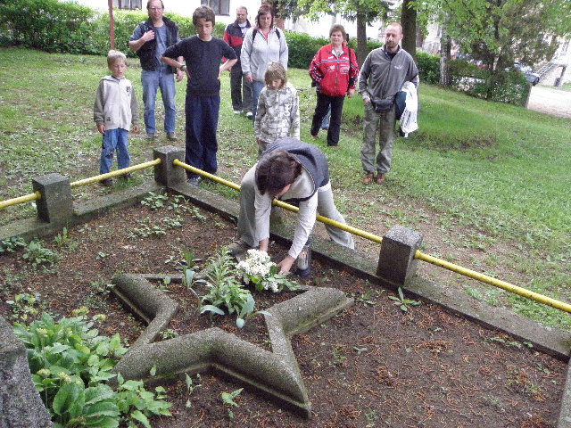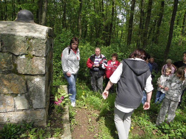 První zastavení bylo u památníku sovětských vojáků před budovou bývalého MNV, kde jsme položili symbolickou kytičku šeříků. Dále naše cesta pokračovala přes Václavku k pomníku zvanému Partyzán. Připomíná tragickou událost z posledních dní války a jeho kamenná stavba s helmou nahoře je známá všem padochovským (aspoň doufám). I zde jsme provedli pietní ceremoniál a pokračovali lesní cestou k vodárně - tzv."Doméčku".