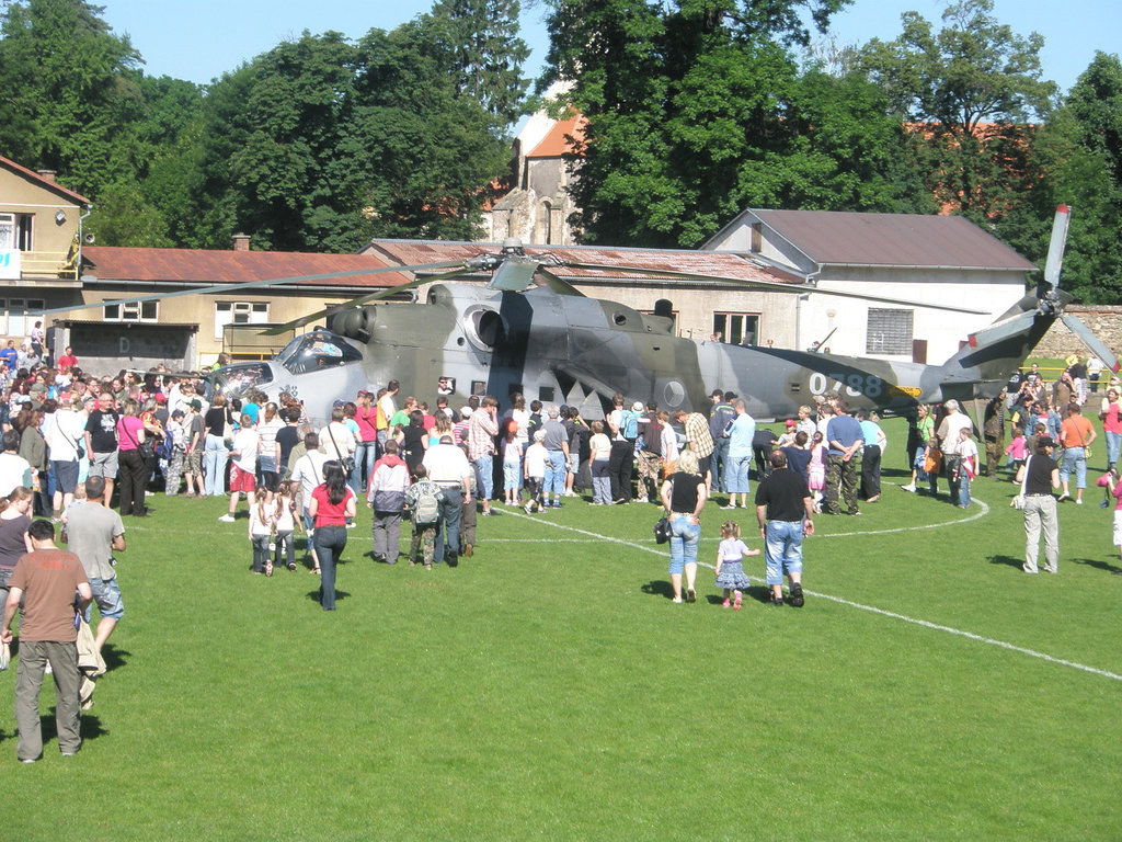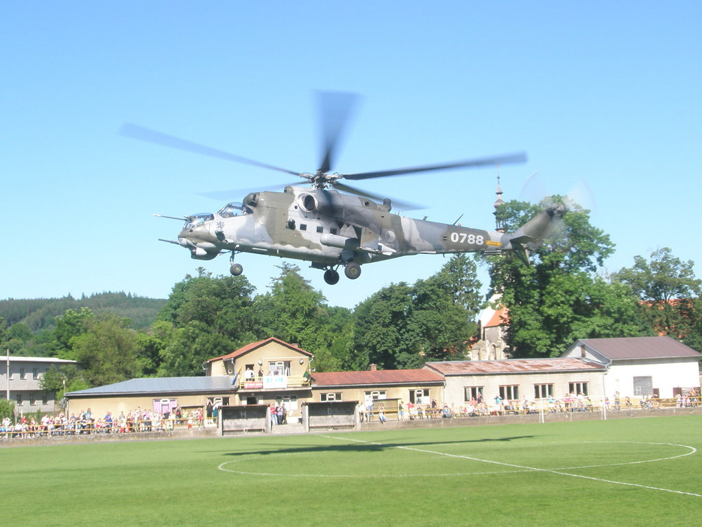 Další záběry v galerii jsou z přistání bojového vrtulníku MI 24 v Oslavanech na stadionu o týden později. Tento mohutný stroj se předvedl v celé své kráse jak za letu, tak později i na ploše stadionu zblízka. Pro všechny fanoušky techniky to byla ztraceně pěkná podívaná.