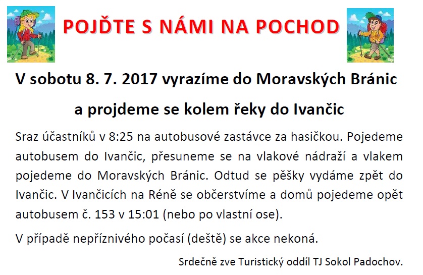 AKCE Pojďte s námi na pochod V sobotu 8.7.2017 vyrazíme do Moravských Bránic a projdeme se kolem řeky do Ivančic. Akce 3. červenec 2017 Předchozí Následující