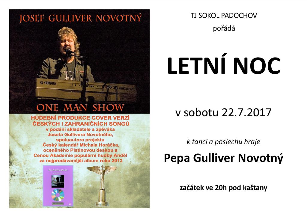 AKCE Letní noc - zábava Přijďte v sobotu 22.7.2017 pod kaštany na sokolovnu v Padochově. Bude se zde tančit a hrát nám bude Pepa "Gulliver" Novotný. Akce 12. červenec 2017 Předchozí Následující