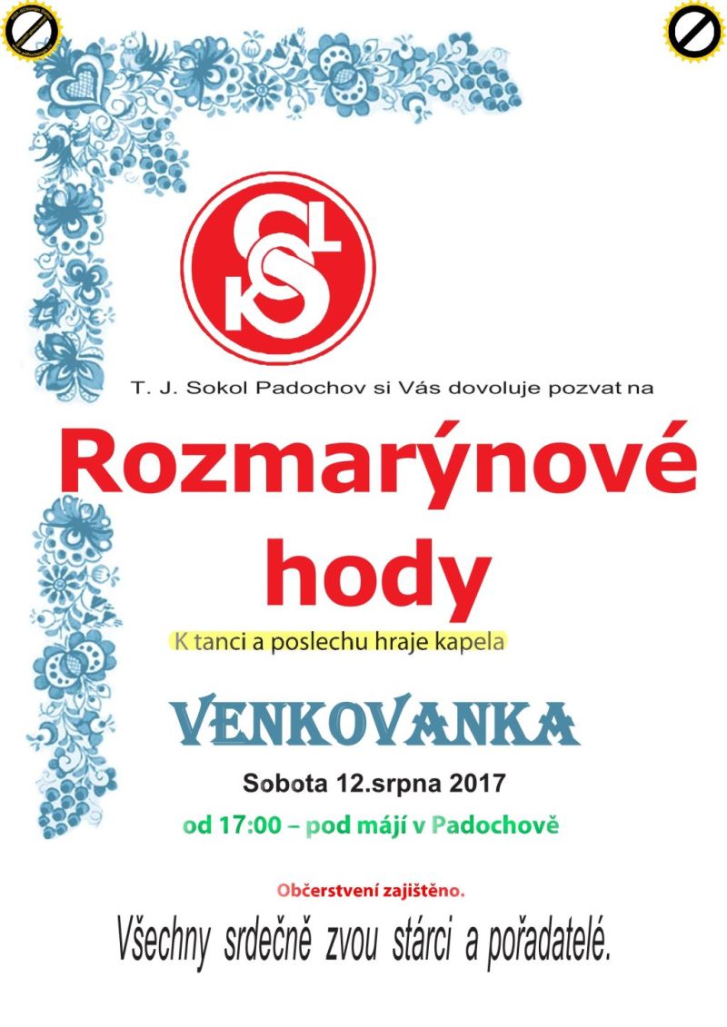 Zveme Vás v sobotu 12.8.2017 v 17:00 na tradiční ROZMARÝNOVÉ HODY. Bude se hodovat, tancovat, pít, zpívat a bude také půlnoční překvapení od stárků. Počasí bude určitě krásné... Těšíme se na vás.