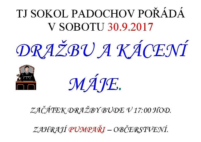 AKCE Dražba a kácení máje Srdečně vás zveme v sobotu 30. září 2017 na Dražbu a kácení máje. Zahrají Pumpaři, připraveno občerstvení. Začátek v 17h. Akce 24. září 2017 Předchozí Následující