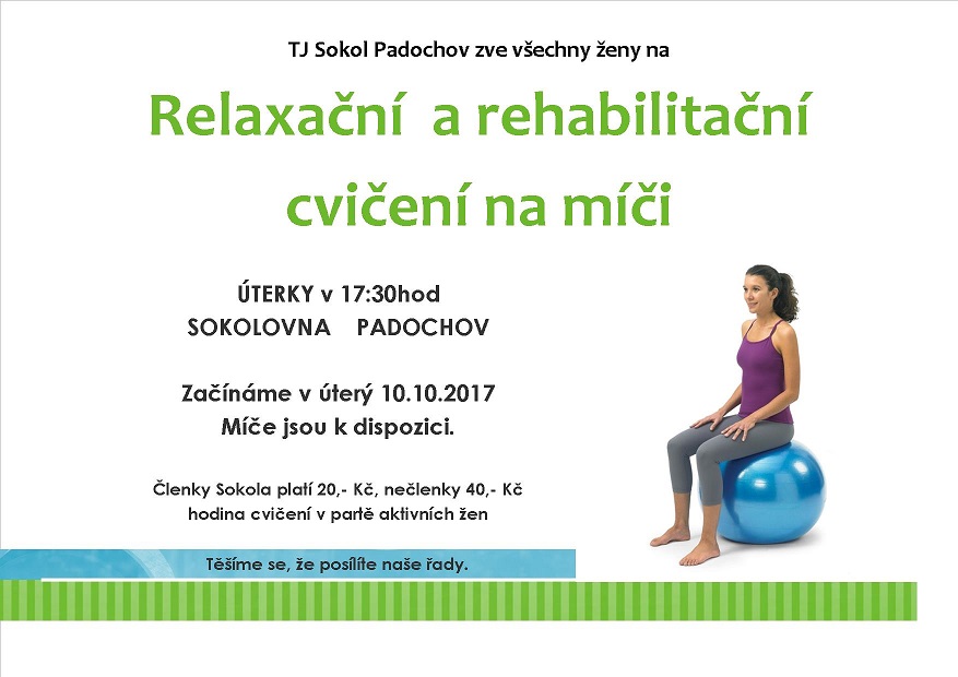 TJ Sokol Padochov zve ženy na rehabilitační a relaxační "Cvičení na míči". Máte-li chuť se protáhnout a udržet se v kondici, cvičíme každé úterý od 17.30 hod. v Sokolovně Padochov. Začínáme v úterý 10.10. 2017. Míče jsou k dispozici. Členky Sokola platí 20,- Kč, nečlenky 40,- Kč za hodinu cvičení v partě aktivních žen. Těšíme se, že posílíte naše řady.