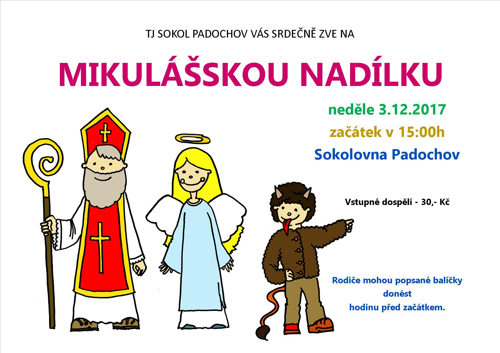 Tak jako každý rok i letos, srdečně zveme všechny děti a jejich rodiče, na tradiční Mikulášskou nadílku. Přijďte v neděli 3.12. 2017, od 15h budeme nadělovat. Rodiče mohou balíčky pro své ratolesti donést hodinku předem. Děkujeme.