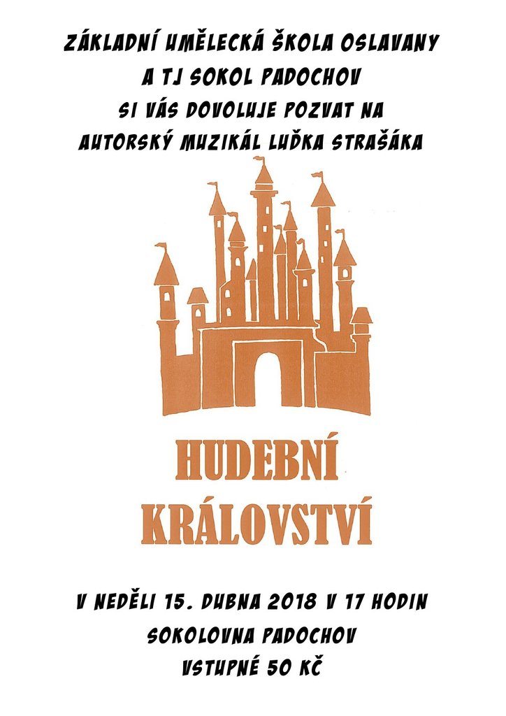 AKCE Muzikál TJ Sokol Padochov a ZUŠ Oslavany zvou na muzikál "Hudební království". Přijďte v neděli 15.4.2018. Akce 16. březen 2018 Předchozí Následující