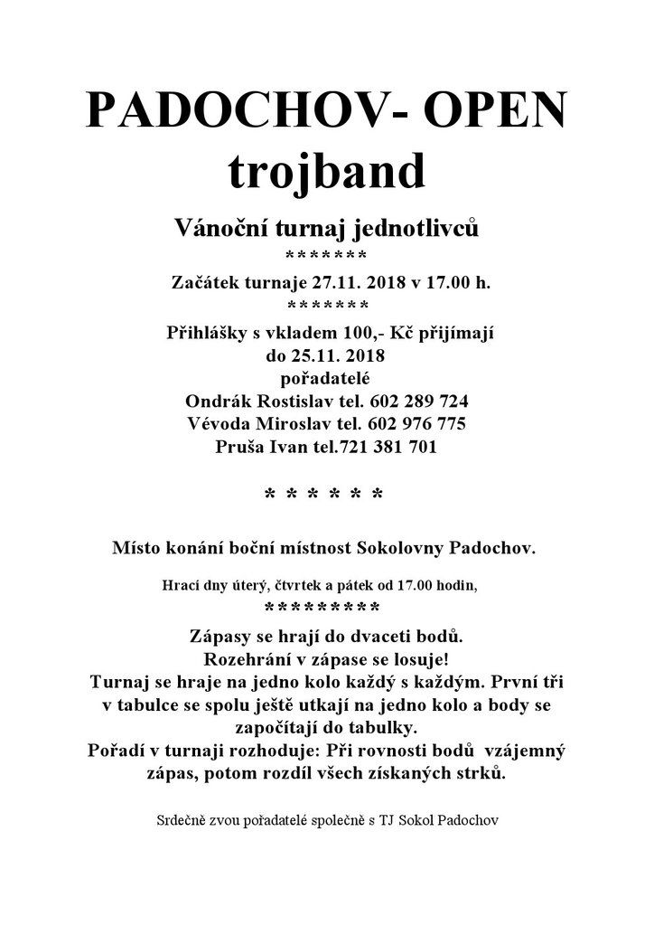 AKCE PADOCHOV - OPEN trojband Zveme Vás na otevřený Vánoční turnaj jednotlivců v trojbandu dne 27.11.2018 v 17 h v Sokolovně v Padochově. Akce 20. listopad 2018 Předchozí Následující