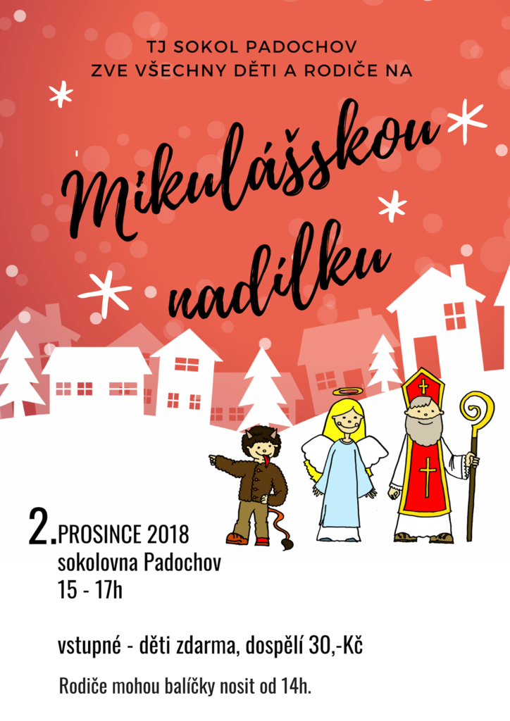 AKCE Pozvánka na Mikulášskou nadílku Zveme Vás na Mikulášskou nadílku která proběhne v neděli 2.12.2018 v Sokolovně v Padochově v 15 h. Akce 20. listopad 2018 Předchozí Následující
