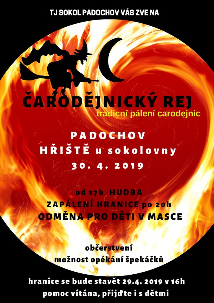 Tradiční pálení čarodějnic v Padochově proběhne na hřišti u sokolovny 30.4. Od 17 hod. hudba, odměna pro děti v masce, možnost opékání špekáčků. Samotné zapálení hranice bude po 20 hod.