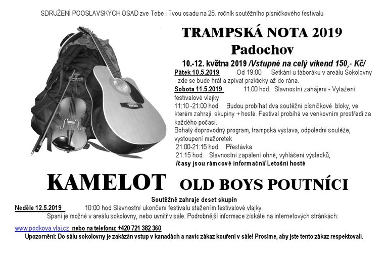 Sdružení pooslavanských osad zve na 25. ročník soutěžního festivalu Trampská nota 2019 v Padochově, v termínu 10.-12.5. v areálu Sokolovny.