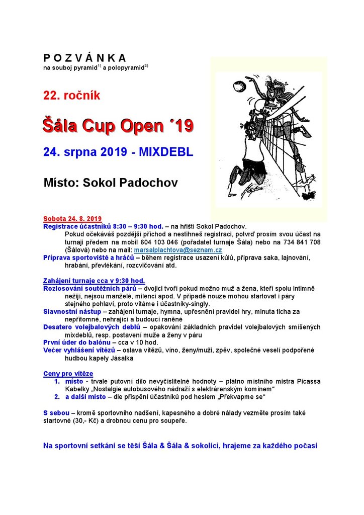 AKCE Šála Cup Open 2019 Pozvánka na 22. ročník Šála Cup Open 2019 dne 24.8.2019 na hřišti TJ Sokol Padochov. Akce 4. srpen 2019 Předchozí Následující