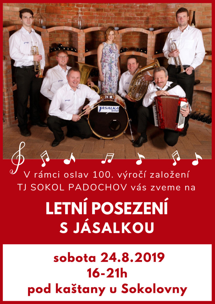 V rámci oslav 100. výročí založení TJ Sokol Padochov vás zveme na letní posezení s Jásalkou v sobotu 24.8.2019 v 16h pod kaštany u Sokolovny.