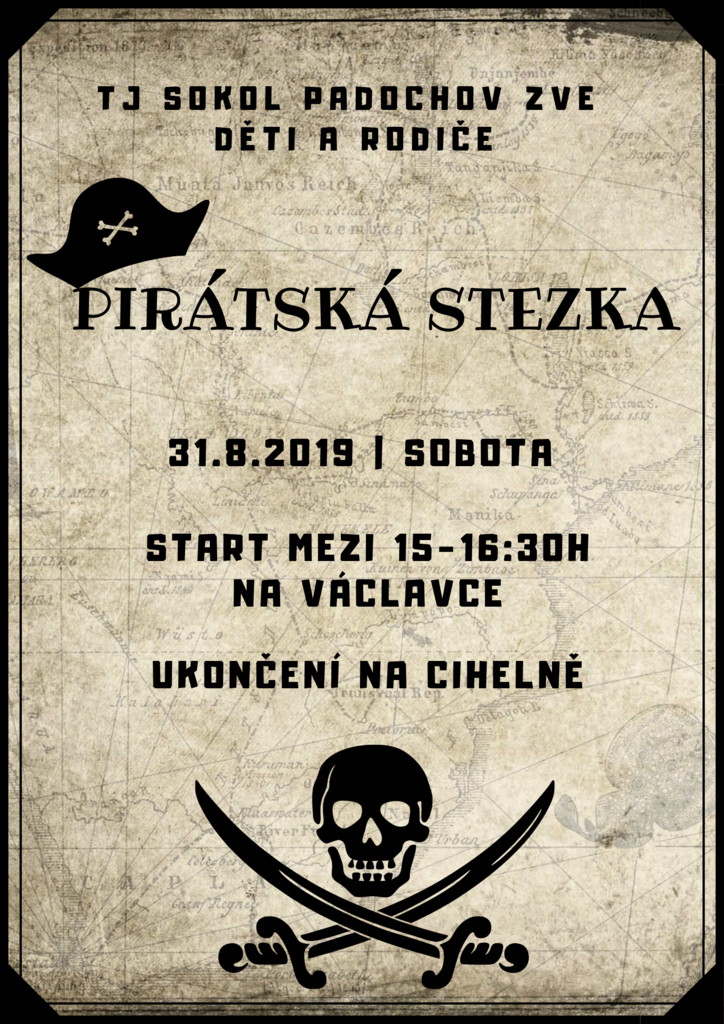 TJ Sokol Padochov zve děti a rodiče v sobotu 31.8.2019 na Pirátskou stezku. Start mezi 15:00-16:30 na Václavce. Ukončení akce proběhne na cihelně.