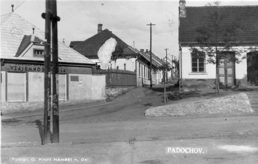 Jistě většina čtenářů pozná na tomto snímku domy na návsi v Padochově. Na levé straně je v současnosti Dům sociální péče s obchůdkem textilu, novin a časopisů v pronájmu paní Grégrové.