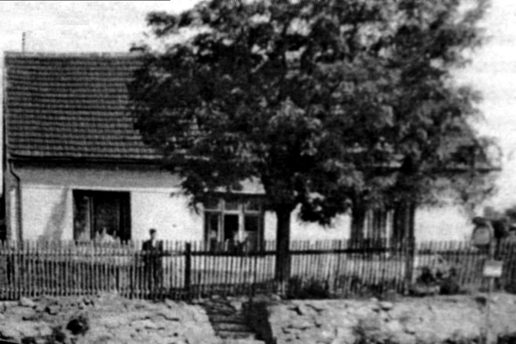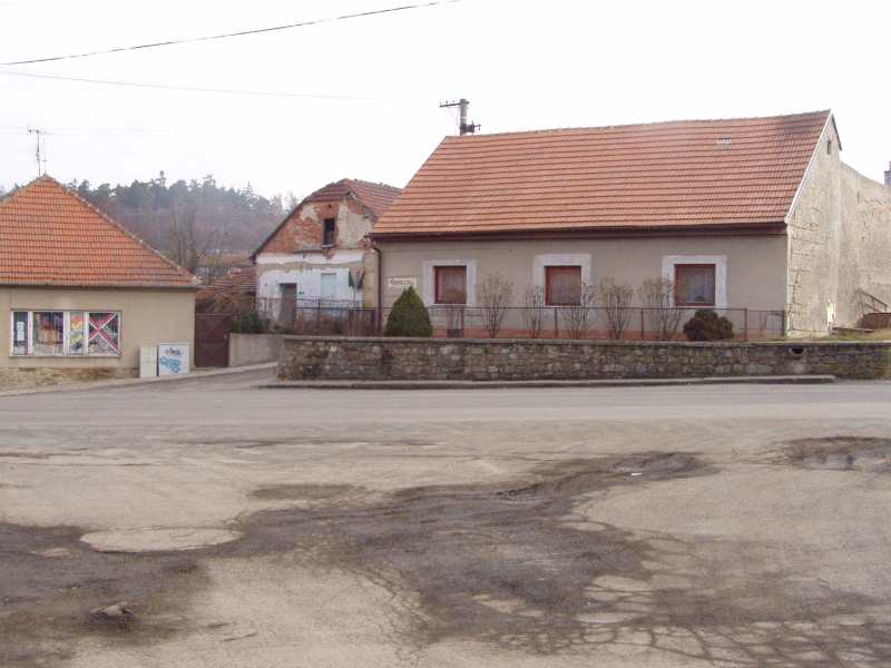 Uprostřed, jak vidíme býval docela pohledný dům se zahrádkou. Na pravé straně je budova kovárny p. Pokorného s vchodem a vraty do dvora. Tuto kovárnu si zaregistroval na zdejším úřadě pan Matěj Pokorný 2.8.1901. Kovárna byla zrušena v 50. létech, tak jako mnoho dalších soukromých řemeslníků. Posledního urostlého, zdatného, vousatého kováře pana Evžena Pokorného jsem měl tu čest poznat jako malý kluk při kování koní. Na snímku druhý zleva. Po panu Pokorném zde bydleli Lysoňkovi, po nich Karel Doležal, který se u starého pána vyučil kovářskému řemeslu.