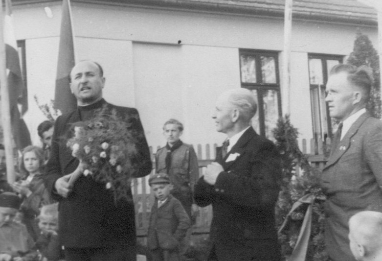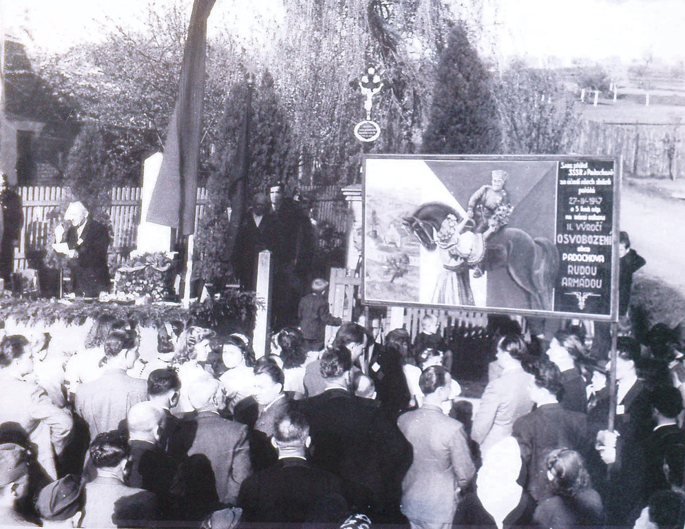 Byl to gardový vojín Konončuk Matvěj Avramovič (50 let), gardový staršina Sevělov Fedor Ivanovič (32 let), gardový poručík Soin Štěpán Sergejevič (30 let) a gardový vojín Běgov Rachman (19 let). Na snímcích při 2. výročí osvobození se zde zastavil průvod obcí, byly položeny kytice k pomníku a přednesen slavnostní projev. Průvod potom pokračoval na Sokolovnu, kde bylo vystoupení dětí a sokolského pěveckého sboru. Na druhém snímku před domem Jana Vespalce jsou zachyceni při slavnostním projevu farář Doseděl, jugoslávský partyzán Kuča a p. Stanislav Vidlák.