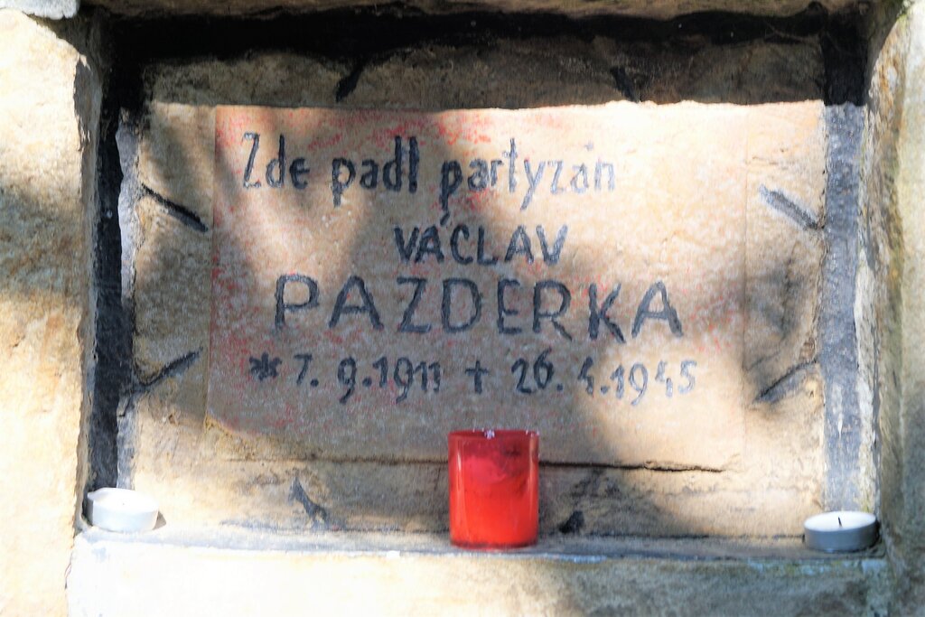 Na pilířku pěticípá hvězda, na desce nápis: Zde odpočívá partyzán Václav Pazderka, čest Jeho památce *7. 9.1911 +26.4.1945.
