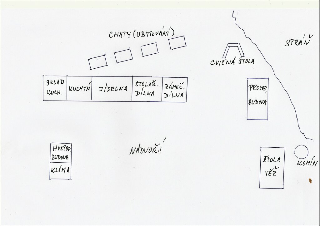 Na plánku jsem načrtl, jak vypadala situace v roce 1945. Škola byla vlastně jednotřídka, kde se učilo 3 dny v týdnu a 3 dny byla praktická výuka. V prvopočátcích se využívalo stolařské a zámečnické dílny a později jezdili učedníci na praxi na důl Ferdinand a Kuklu. Vedoucím učiliště byl Hubert Nevrtal. Mistr tesařské dílny byl pan Kopáček. Mistr kovářského výcviku byl pan Štulík. Češtinu a matematiku vyučoval učitel Maxmilián Škoda. Občanskou výchovu měl pan Oldřich Jančár. K učilišti patřila i cvičná štola, která se nacházela ve stráni k dnešnímu Dřevákovu. V kuchyni „vládla" paní Vespalcová s pomocnicí. Na nádvoří bydlel i kočí pan Klíma. Učební doba měla byt tříletá, ale vzhledem k poválečné situaci byl první ročník zkrácen a mladí havíři nastoupili na náročnou práci po okolních dolech. V poválečných letech se pořádaly nábory na toto povolání pod heslem "Já jsem horník, kdo je víc" a lákali se mladí adepti i na nové uniformy. Přesto se v prvních ročnících podařilo obsadit poměrné málo míst. V roce 1946 se přestěhovali žáci učiliště do dvou místností v budově závodního dolu Kukla pana J. Vokše (viz foto z 1945), kde už bylo slušné bydlení. Zde již si mohla většina učňů lépe odpočinout, nakoupit zboží u obchodníka Jaroslava Kršky, nebo si zajít na pivko k Valešům.