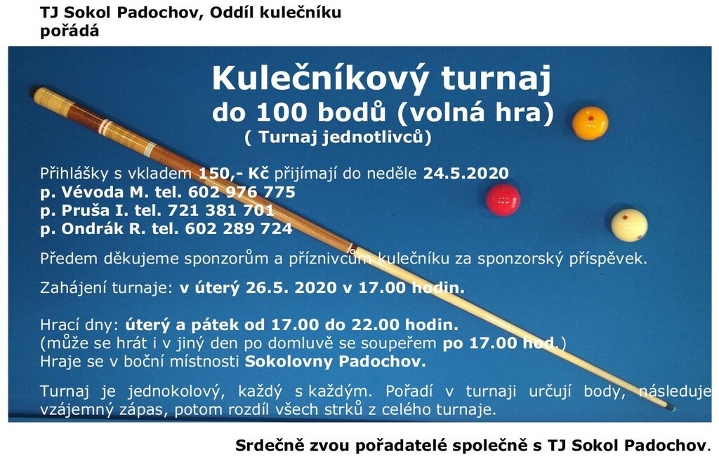 Oddíl kulečníku informuje o možnosti přihlásit se na KULEČNÍKOVÝ TURNAJ do 100 bodů. Přihlášení je možné do neděle 24.5. 2020, turnaj se bude konat od 26.5. 2020 - hrací dny jsou úterý a pátek od 17h. Přihlásit se může kdokoliv. Více informací najdete v pozvánce.