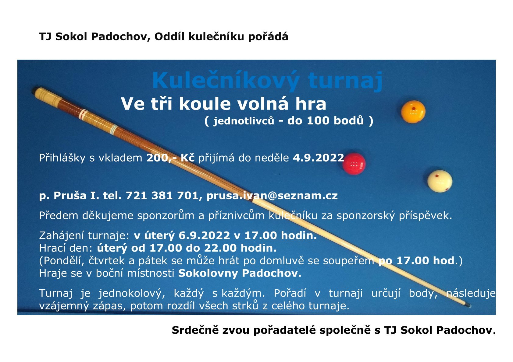 Kulečníkový oddíl společně s TJ Sokol Padochov gratulují vítězi. Tímto děkujeme oddílu Kulečník za uspořádání turnaje navzdory komplikacím způsobené koronavirem a za shovívavost při hlučném nácviku dětí na hody z důvodu deštivého počasí.
