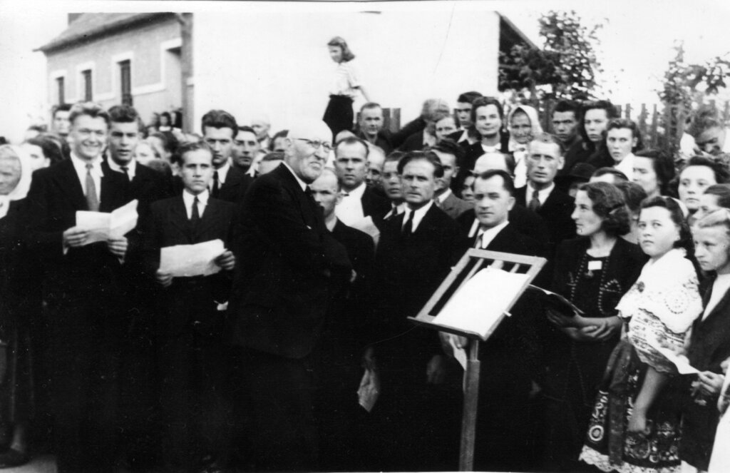 Na dalším snímku vidíte sbormistra pana Machulky na pohřbu sovětských vojáků u křižovatky na Neslovice.